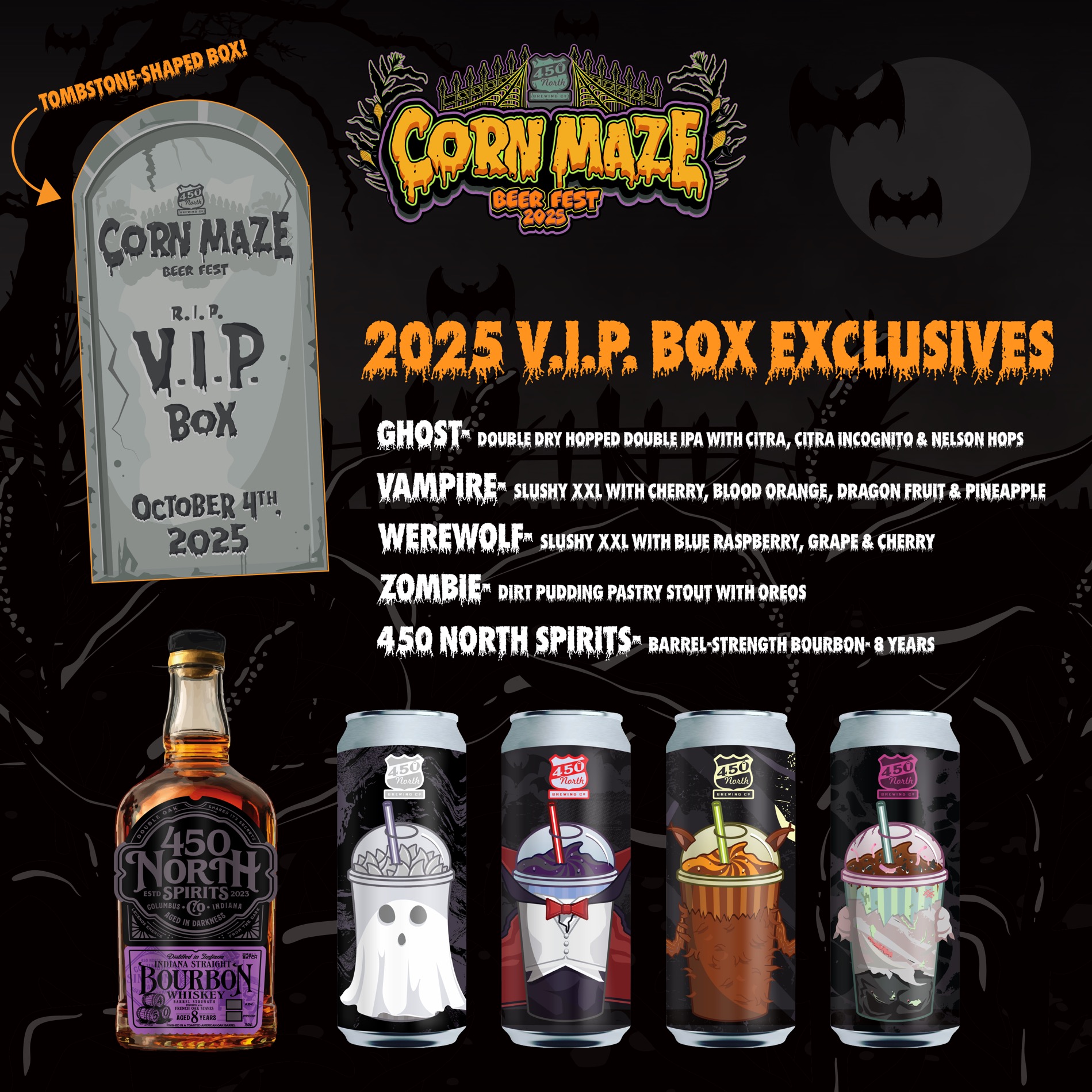 – Elite maze access is from 12:30-6:00PM. Includes an exclusive bottle of 450 North Spirits Bourbon, VIP Gift Box , early entry into the maze, a tasting glass, unlimited beer samples, live music, food vendors, merchandise shopping, ability to purchase to-go 4-packs of beer.